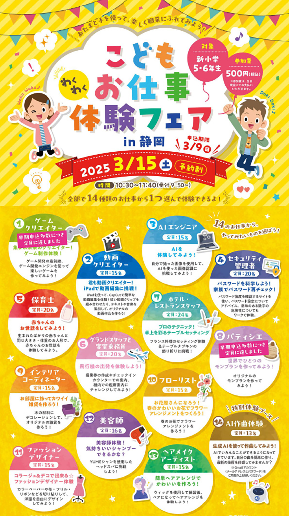 | 内容 | 本グループのノウハウを小学生向けお仕事体験の形で公開します。全14種のブースから、ご希望の職業を選び、体験していただける、キッズ向けの講座を開催します。 |